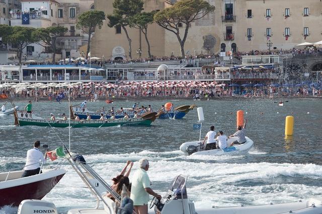 Il vessillo frustato dal vento, la spuma del mare che sale impetuosa e i colori dei quattro galeoni che quasi scompaiono tra le onde. E’ l’immagine della forza. E’ l’immagine dei 32 vogatori che spingono a colpi di remo le quattro imbarcazioni nel mare increspato di Amalfi. Un’immagine che rimanda ai fasti del Medioevo quando le galee delle Antiche Repubbliche Marinare solcavano il Mediterraneo sulla rotta verso nord Africa e Medio Oriente, dove istituirono fondachi e colonie intrattenendo proficui rapporti commerciali e diplomatici.